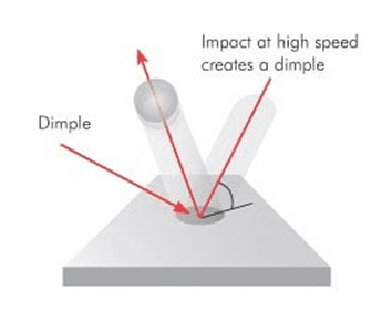 1단계: 투사재가 표면에 충돌하면 — 딤플(Dimple) 생성